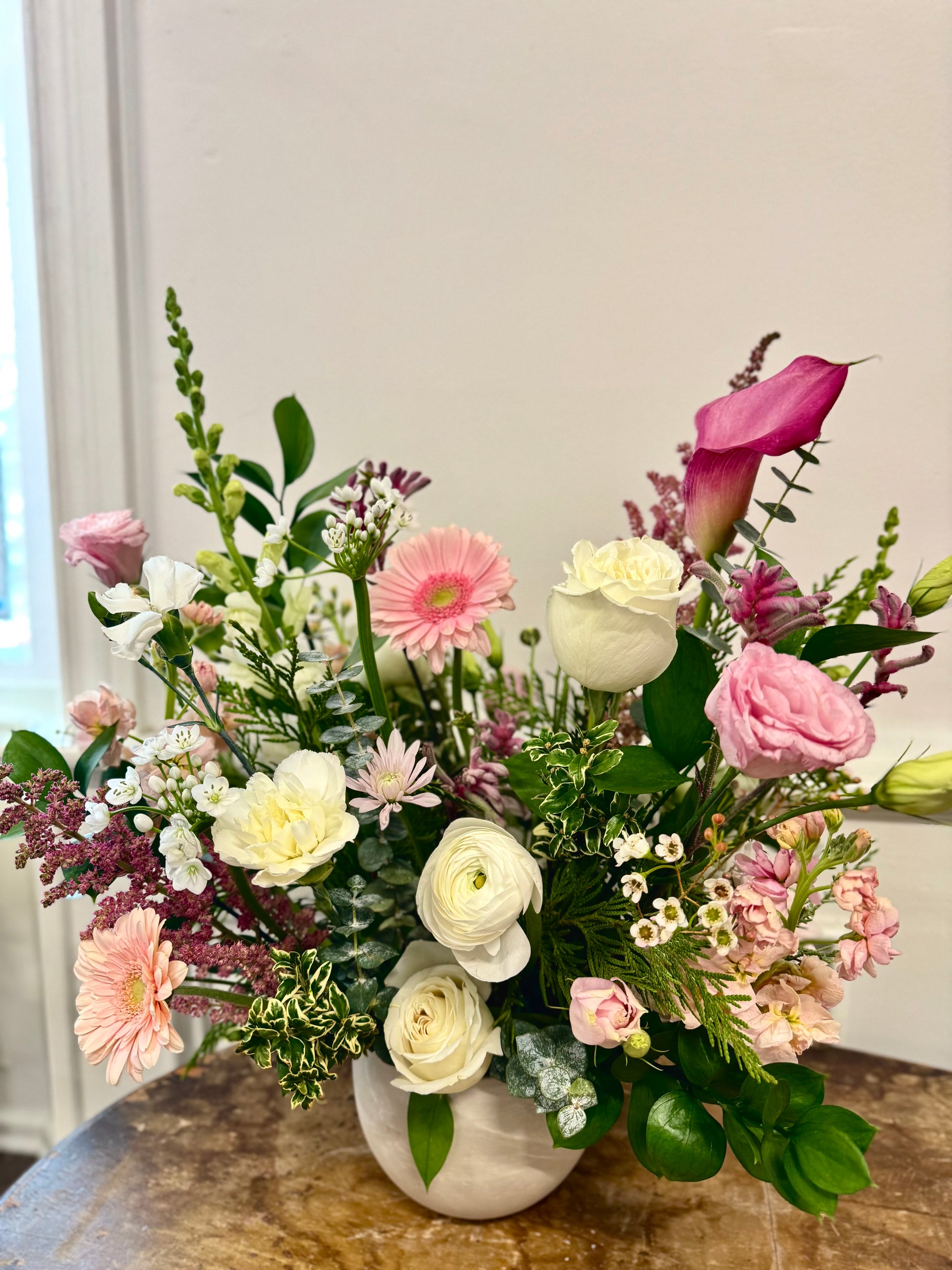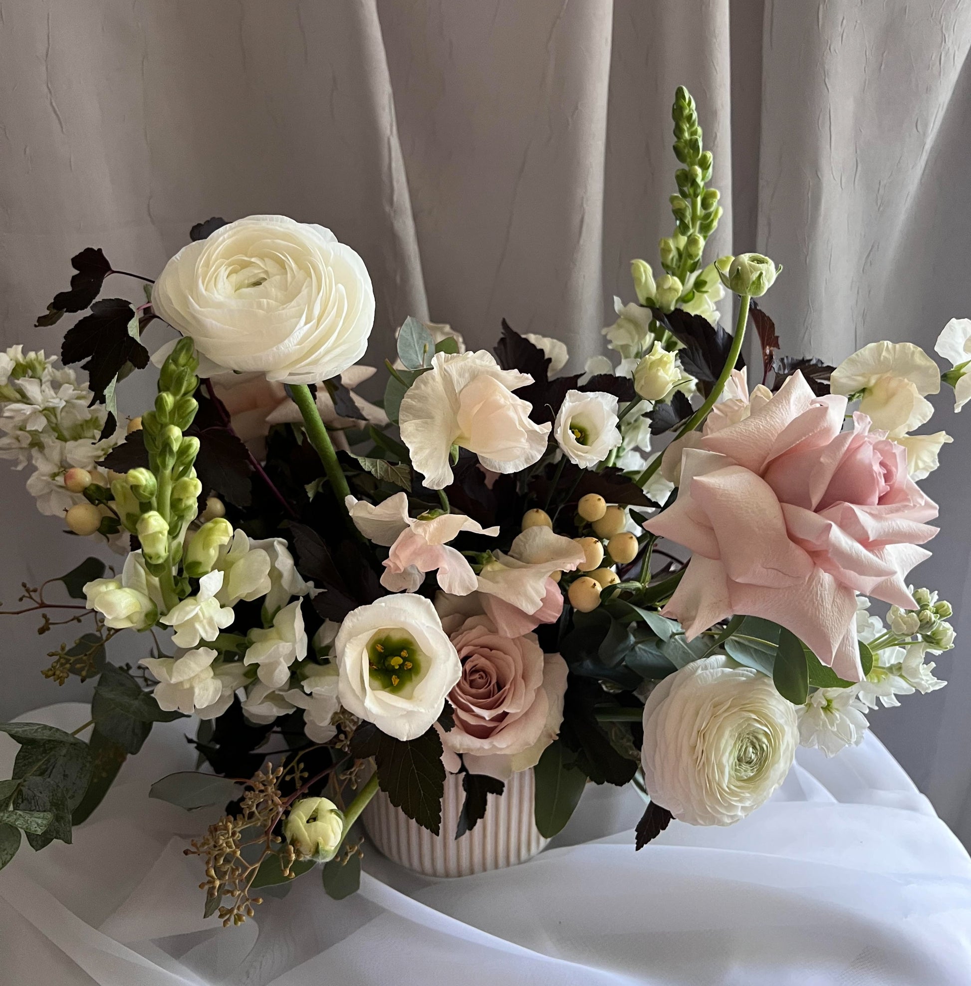 Express your admiration with an enchanting combination of pinks and whites that dance together in sublime harmony. Nothing says I appreciate you quite like this exquisite blend of roses, sweet peas and snapdragons.
