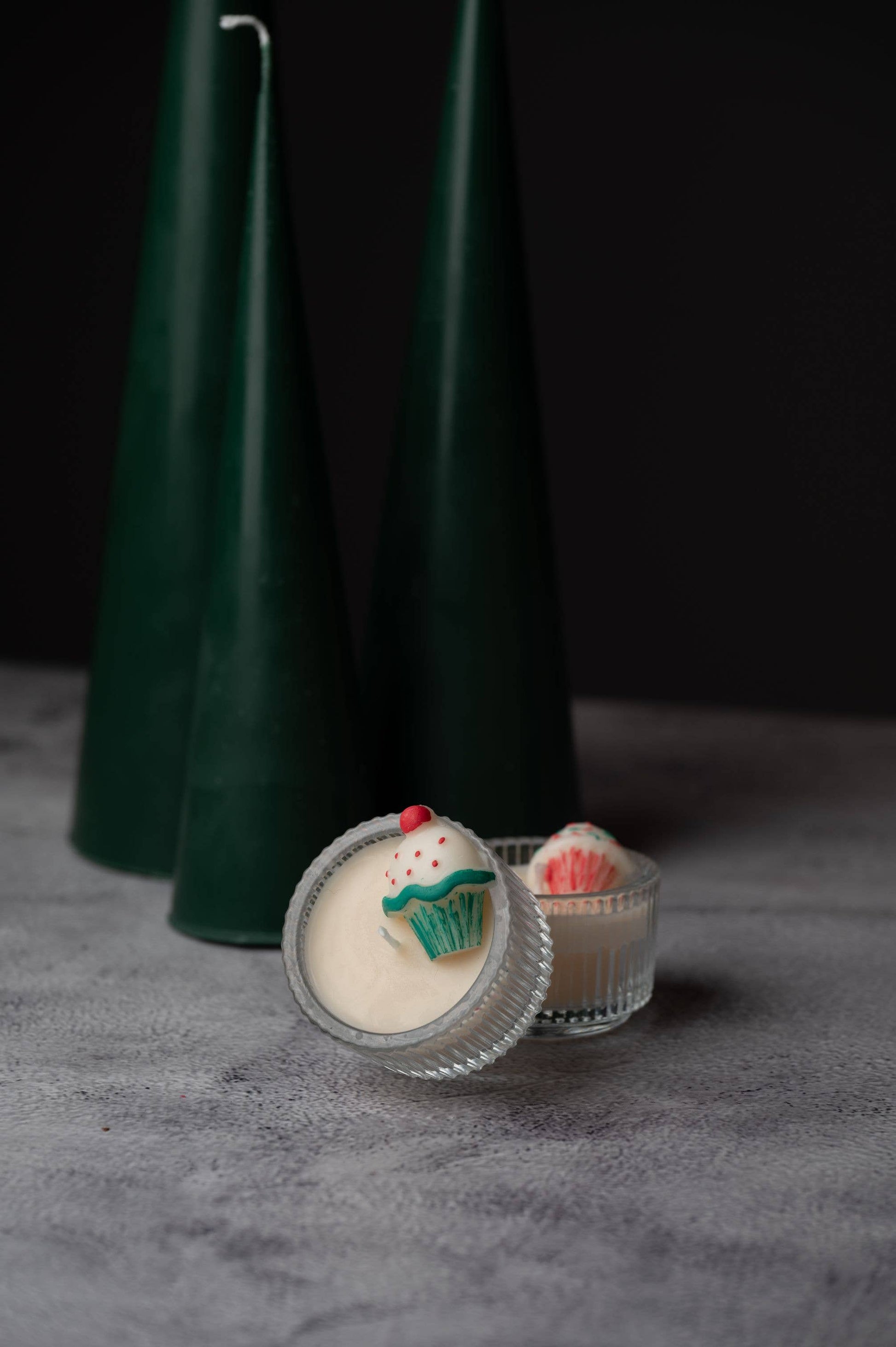 Clear Glass - Height- 1” Diameter- 2” The intricately detailed cupcake, complete with vibrant frosting and sprinkles, adds a charming touch to any room. Encased in a glass holder, this mini candle not only illuminates your space with a warm, inviting glow but also serves scents of warm baking spices!