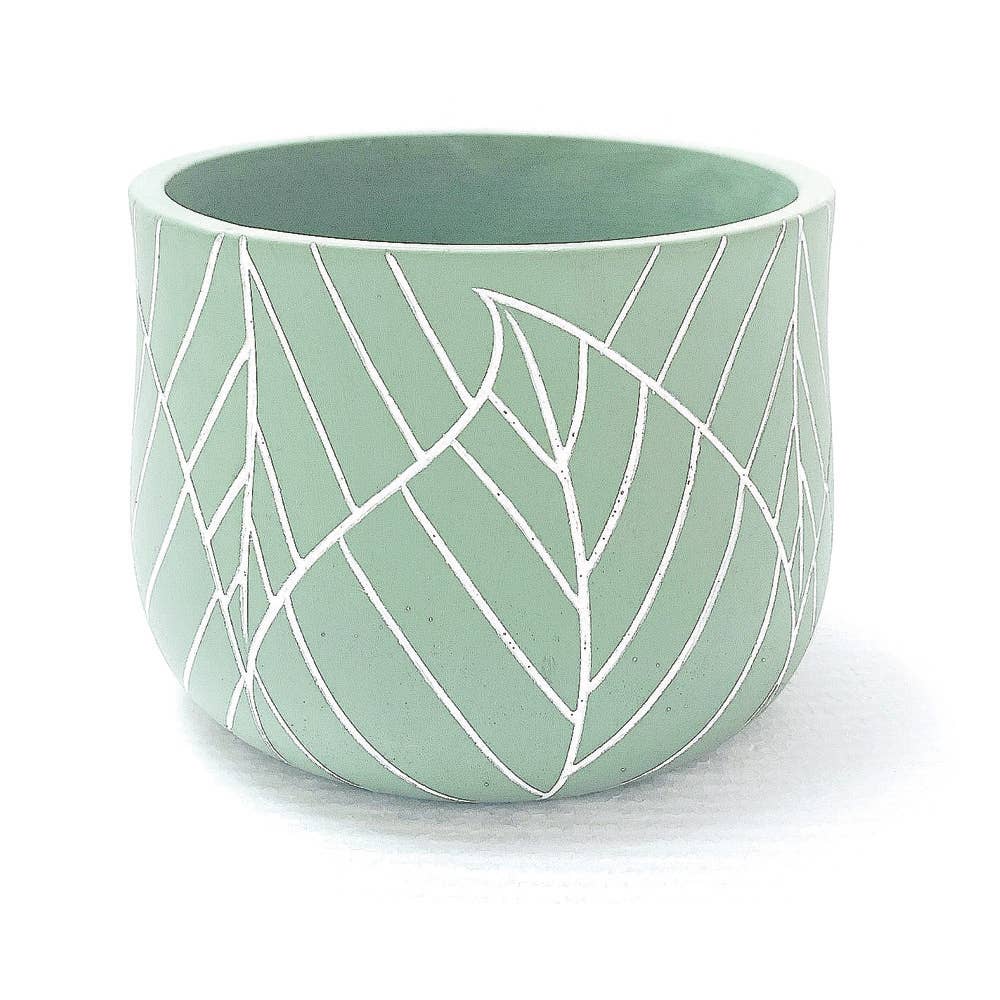 CONCRETE GREEN POT WHITE LEAF EMBOSS