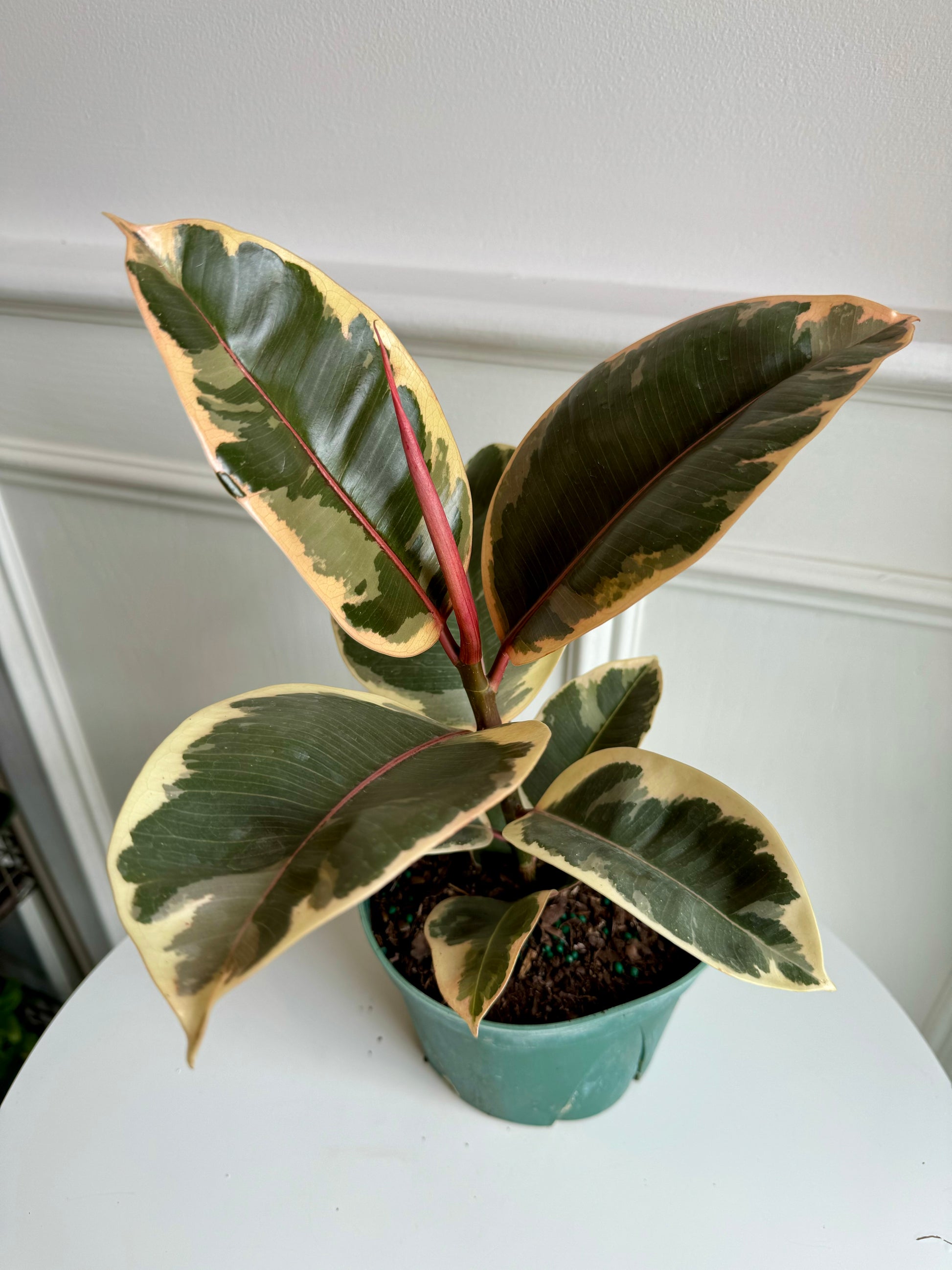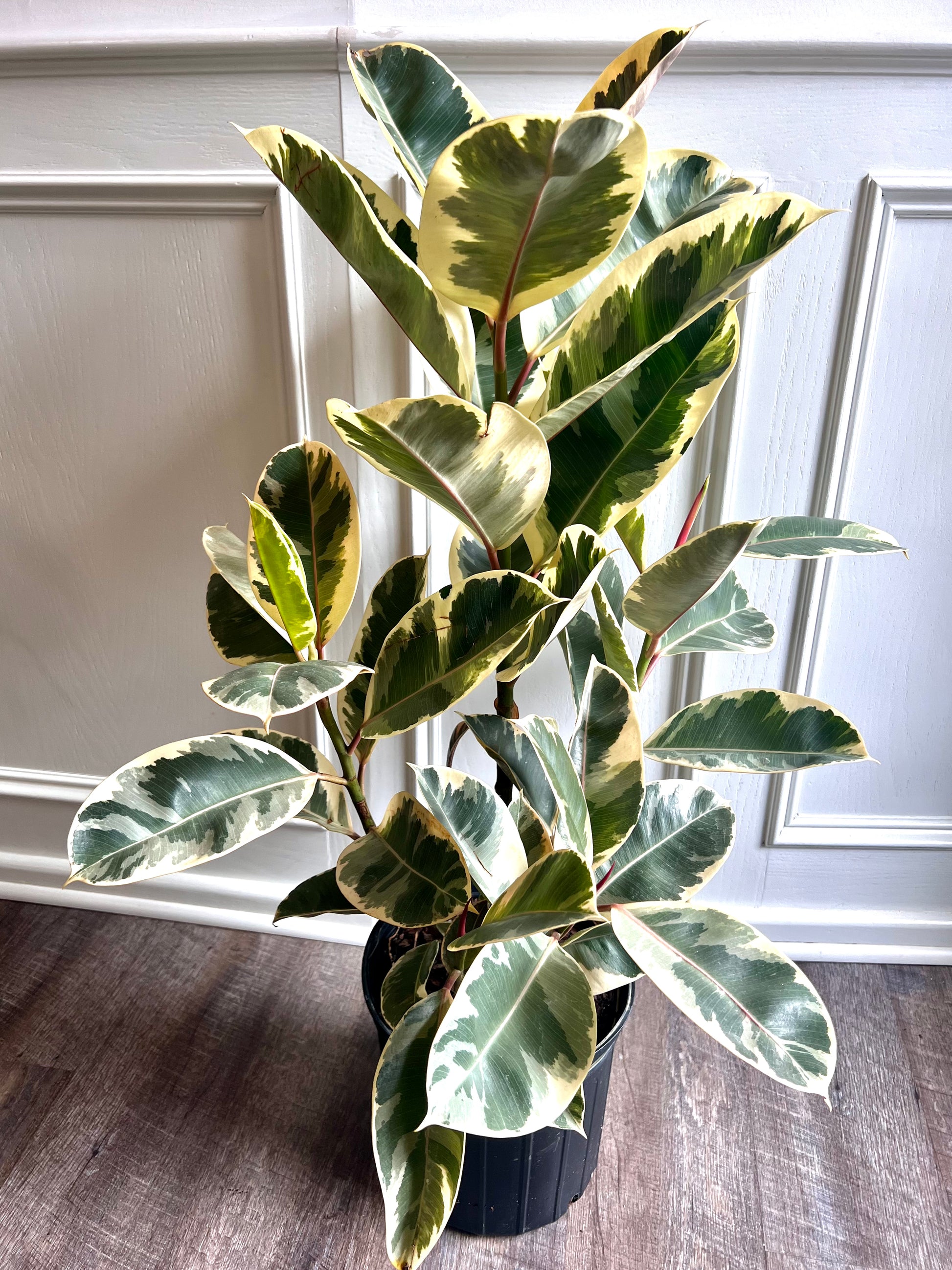 Care Requirements: Ficus elastica 'Tineke' has similar care requirements to other varieties of Rubber Plants. Provide it with bright, indirect light for optimal growth, although it can tolerate lower light conditions. Water the plant when the top inch or two of soil feels dry, and ensure adequate drainage to prevent root rot. Regular misting or providing a humid environment can also promote healthy growth.
