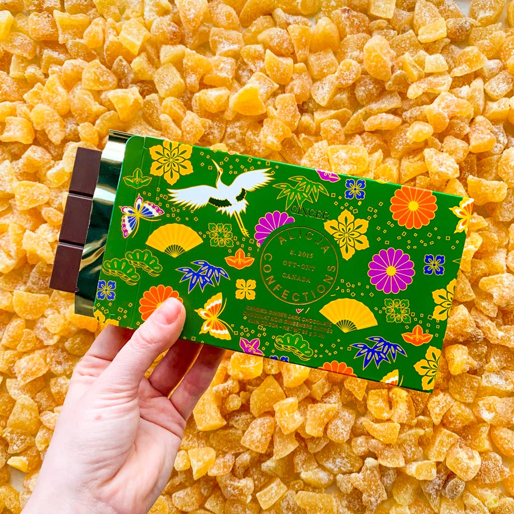 Ginger is a 60.1% dark chocolate bar. Delicious dark chocolate full of candied ginger. A true chocolate classic.