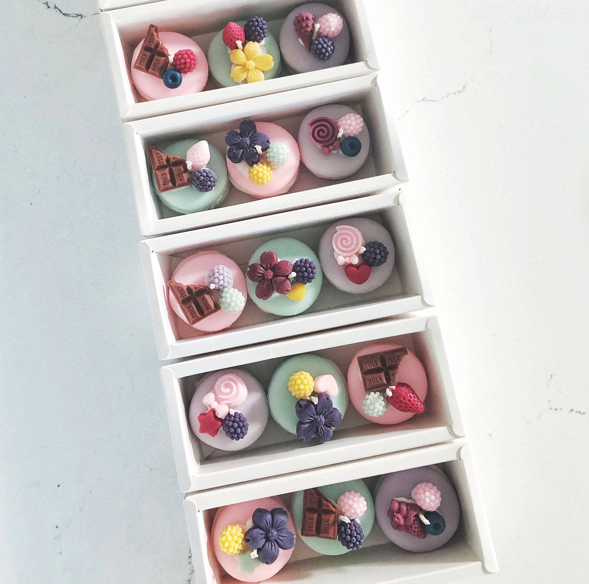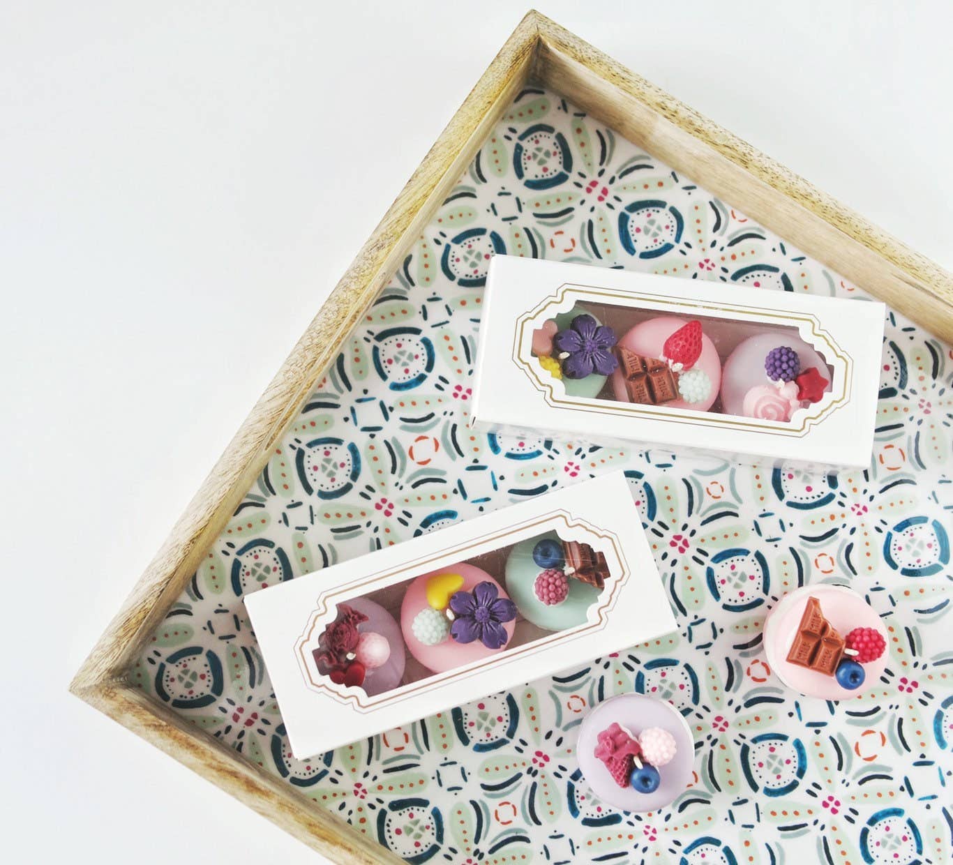 Three macaron candles included in each set. These macaron dessert soy candles are meticulously detailed. They are adorable to look at and smell heavenly also. Each color comes in a different scent. These macarons can also be used as wax melts with the wick removed.