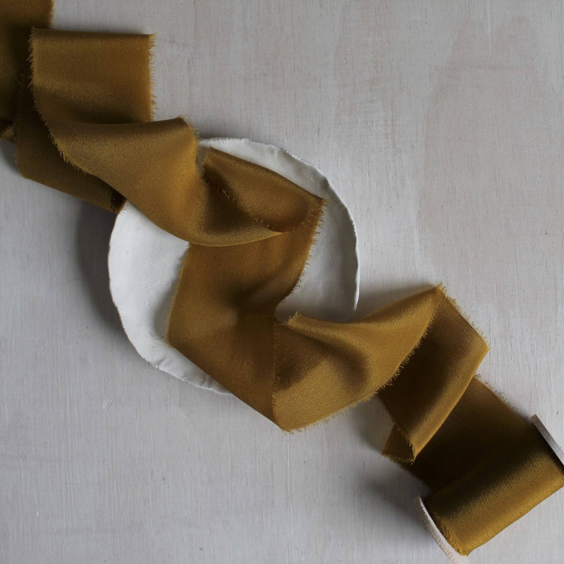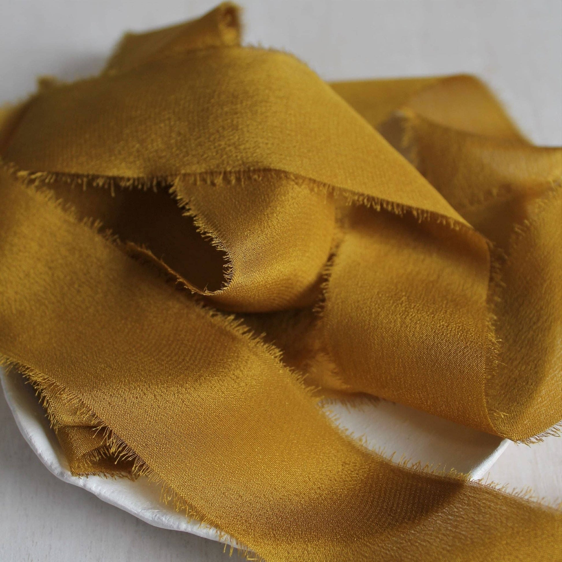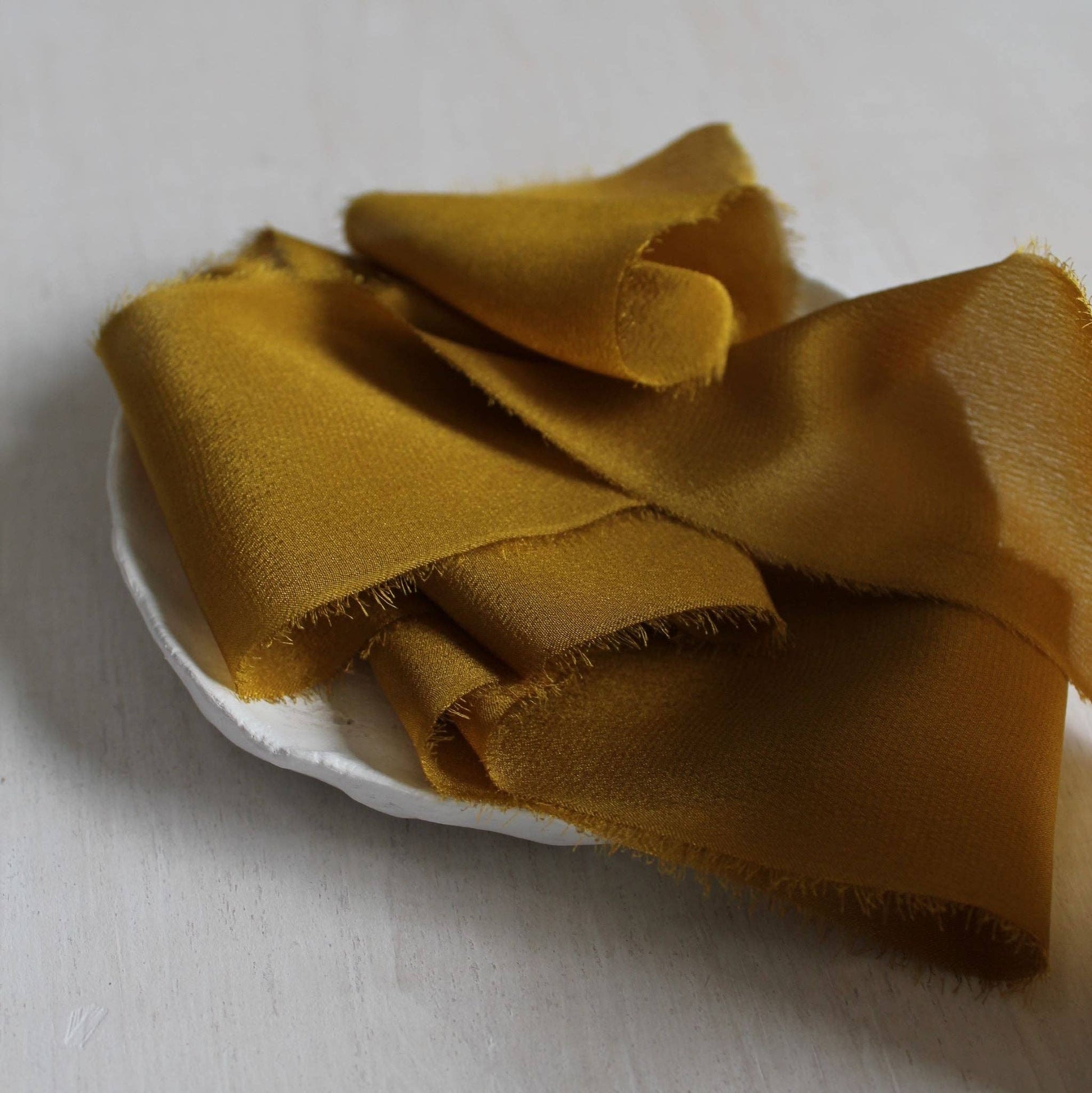 Marigold is a mix between yellow and Orange, it is more of a yellowy marigold colour than orange. Dyed using onion peels 100% Silk Crepe de Chine Hand Torn Approx 3 yards long Perfect for bridal bouquets, wedding stationery, flat lay styling.