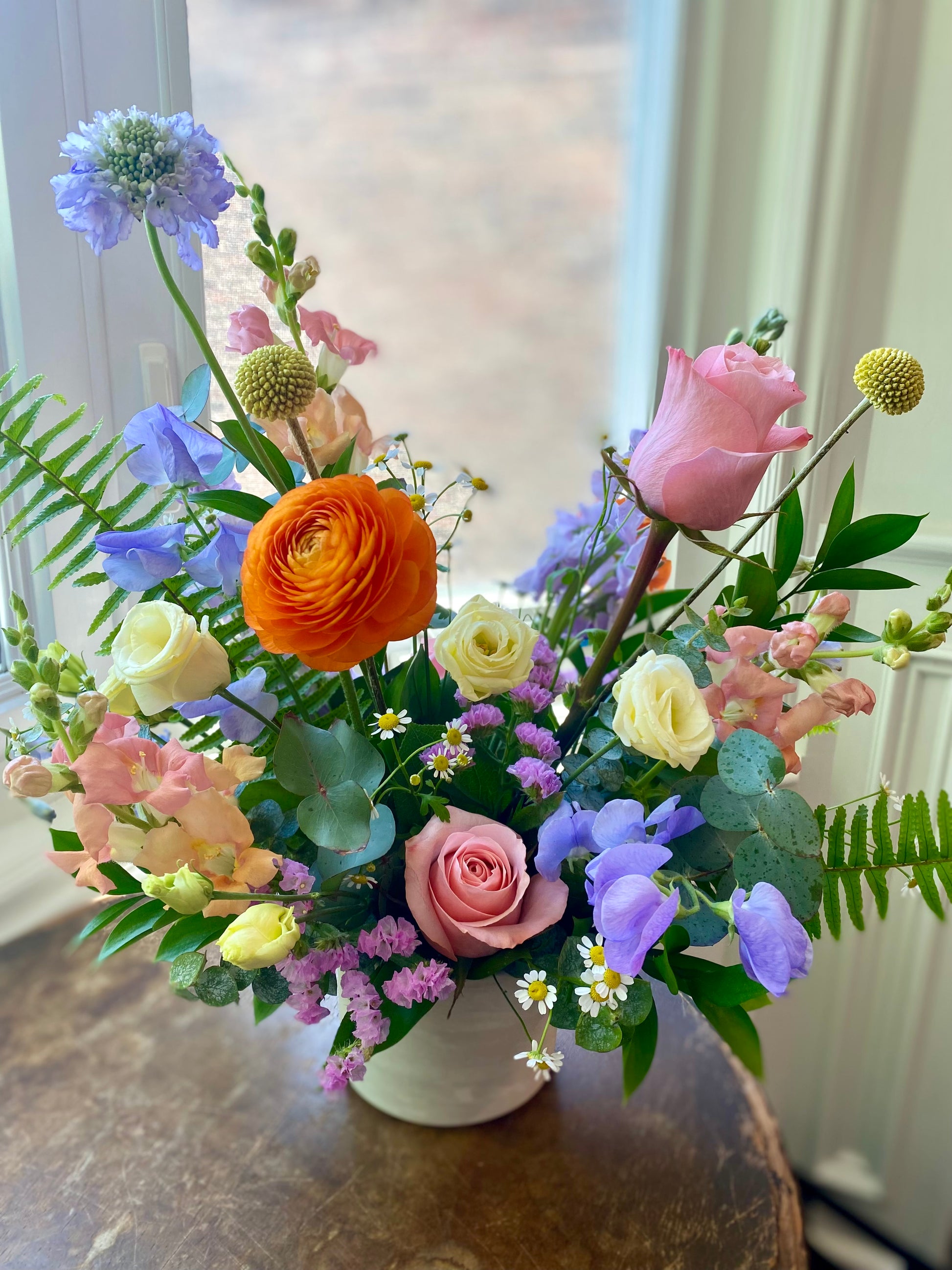 For those who love shades of playful pinks and purples, this arrangement has the undeniable ability to express cheer and love. Tulips, Scabiosa, and Ranunculus sway together with stock, roses and Lisianthus.