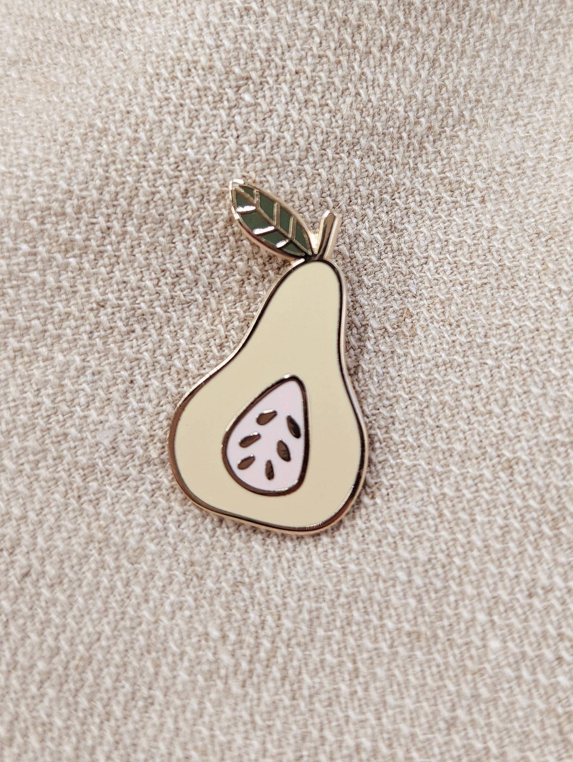 A sweet pear pin. Size: 25mm Gold tone brass Enamel pin Designed in Montreal, Canada