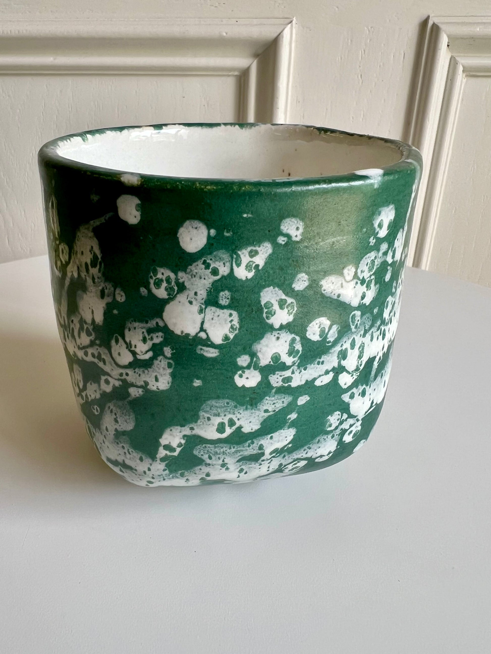 Green splatter pot hand built with care in small batches by local artist Pauline Halsey.