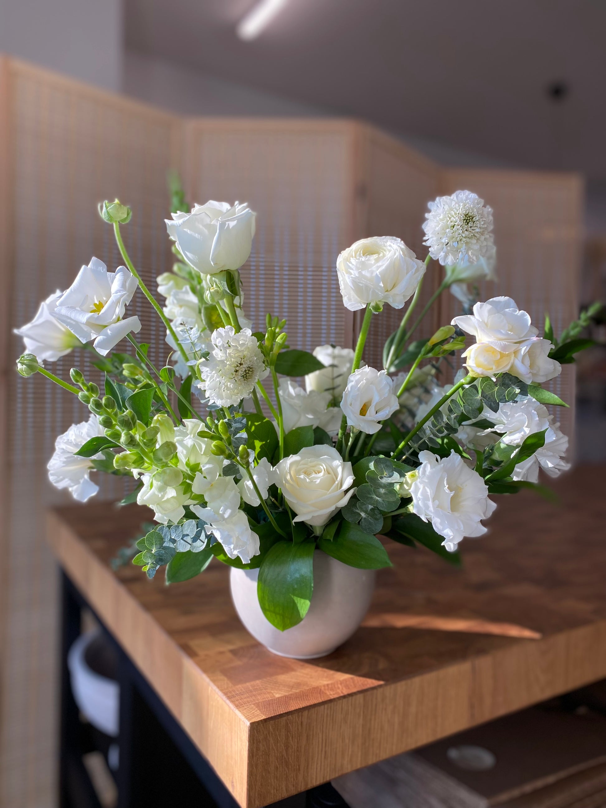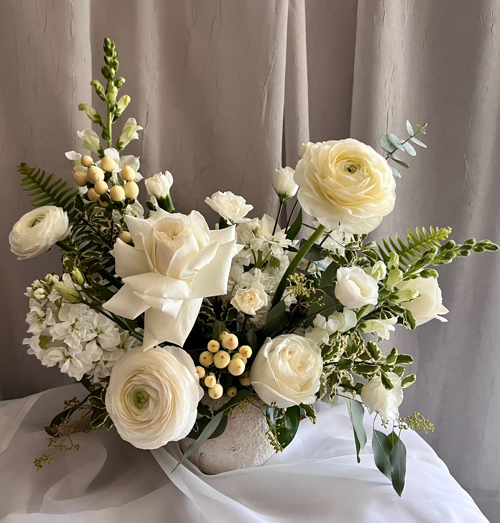 Send a loving message with this comforting all white arrangement. Eucalyptus and snapdragons flow peacefully with white roses and ranunculus.