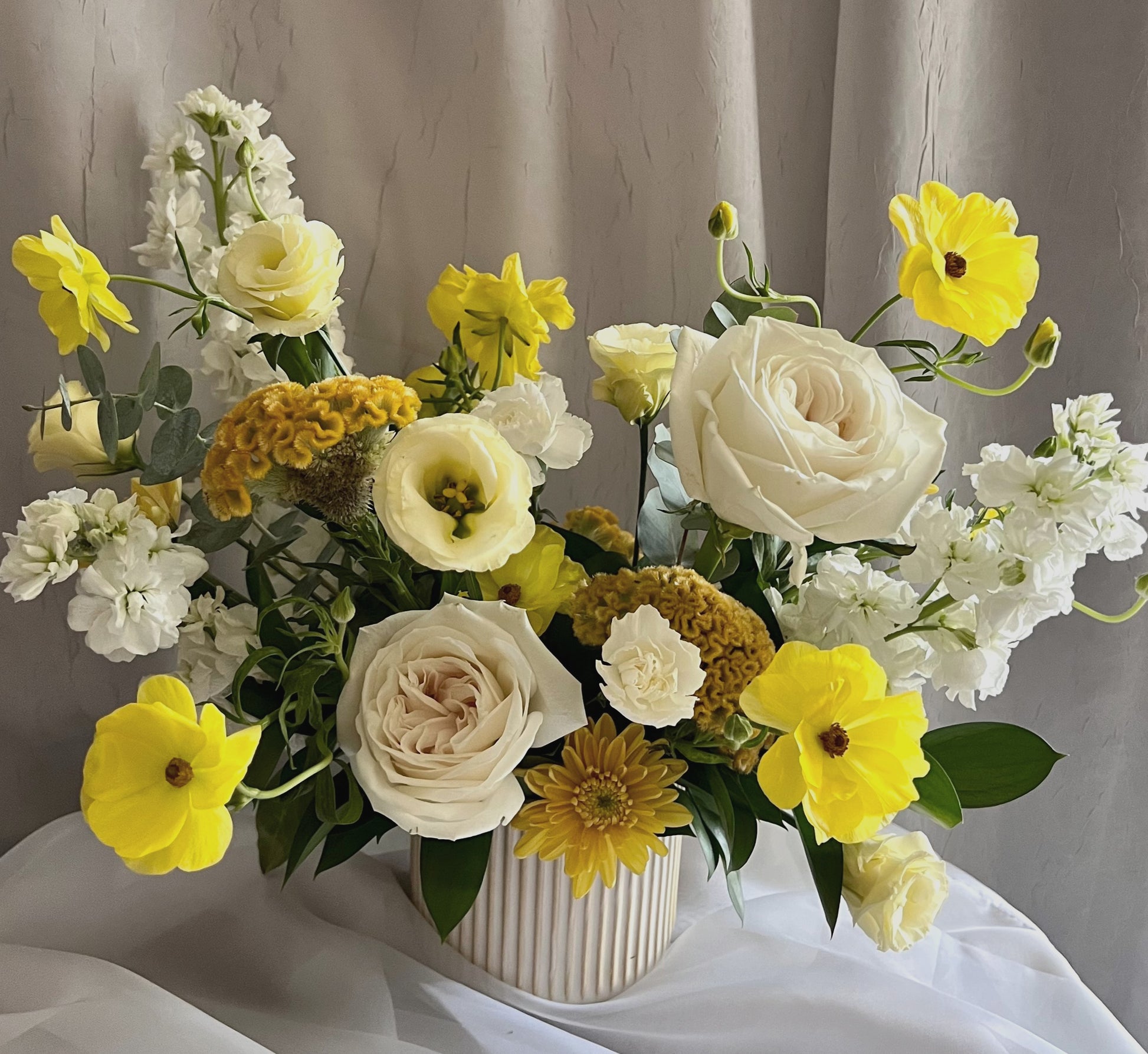 This upbeat arrangement is sure to put a smile on anyone’s face. Vibrant yellows contrasting bright whites make a cheerful statement. Ranunculus and stock compliment each other to create bubbly textures and whimsical shapes.