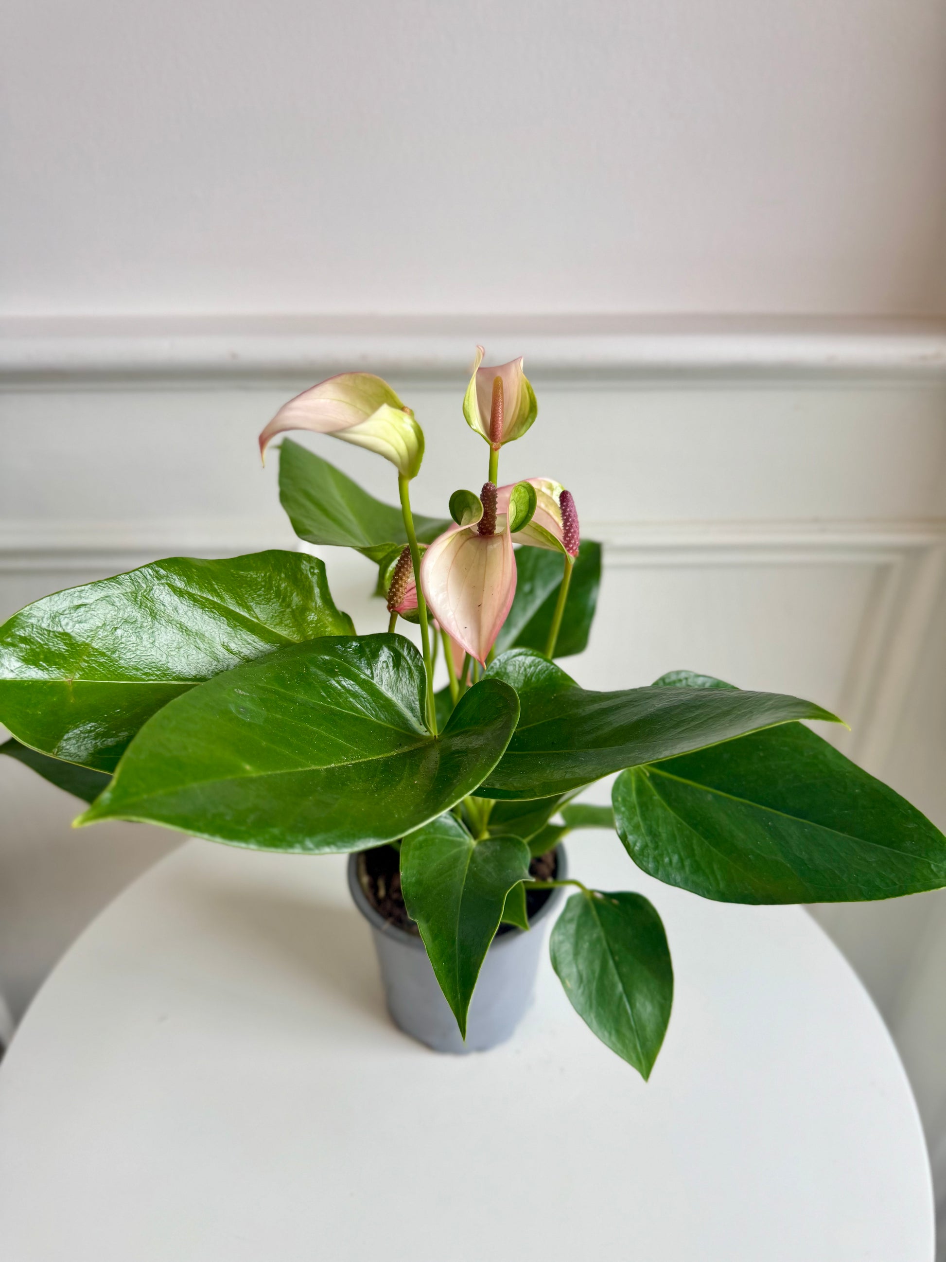 Care Requirements: Anthuriums thrive in bright, indirect light. They prefer well-draining soil that is kept consistently moist but not waterlogged. Allow the top inch or two of soil to dry out slightly between waterings. Anthuriums also appreciate high humidity, so misting the foliage or placing the plant on a pebble tray filled with water (but not making contact with the soil or roots) can help maintain adequate humidity levels. Keep the plant in a warm environment with temperatures between 65°F to 80°F (18°C to 27°C) and protect it from drafts and temperature extremes.