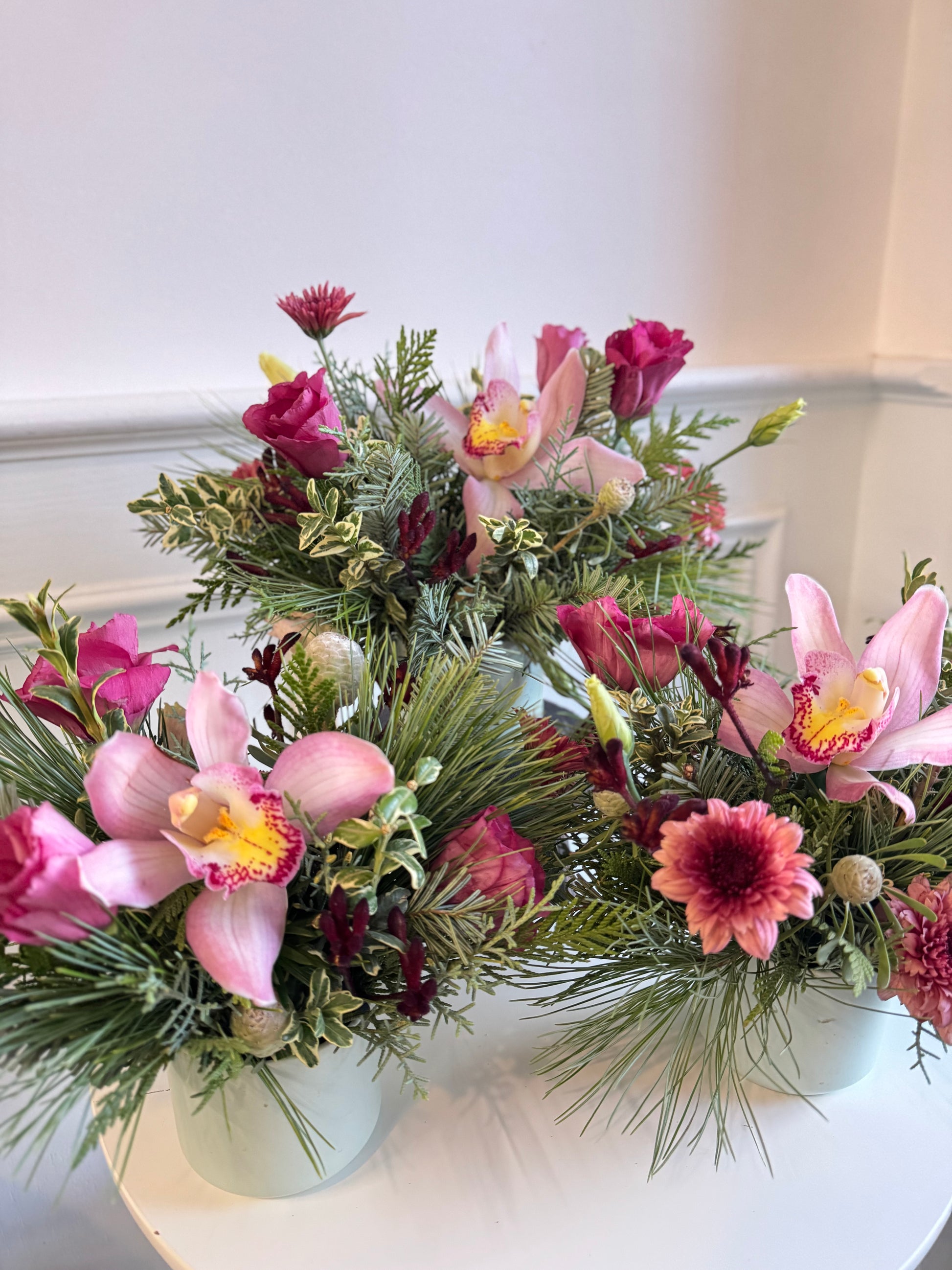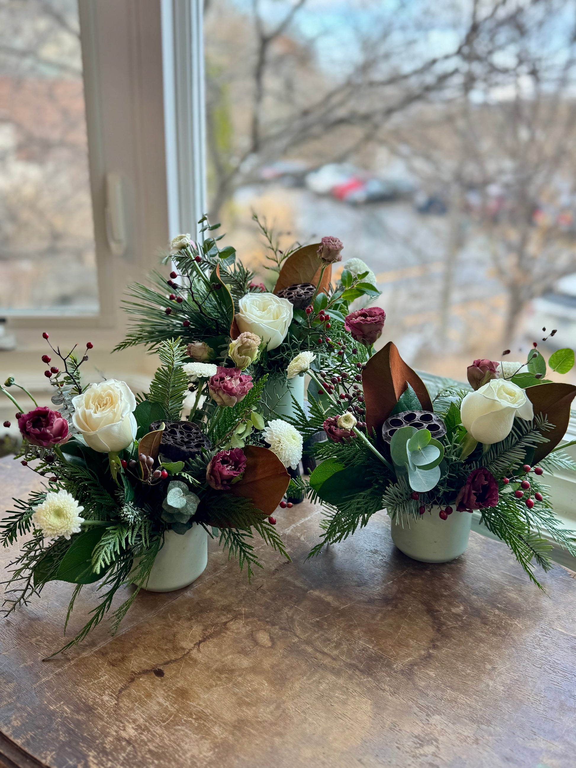 A charming winter accent designed with seasonal greenery in classic Christmas tones. Perfect on its own or styled as a trio, this mini arrangement brings a fresh, living touch to your holiday table, mantel, or entryway. Simple, festive, and quietly elegant—just enough to add warmth and life to your Christmas setting.